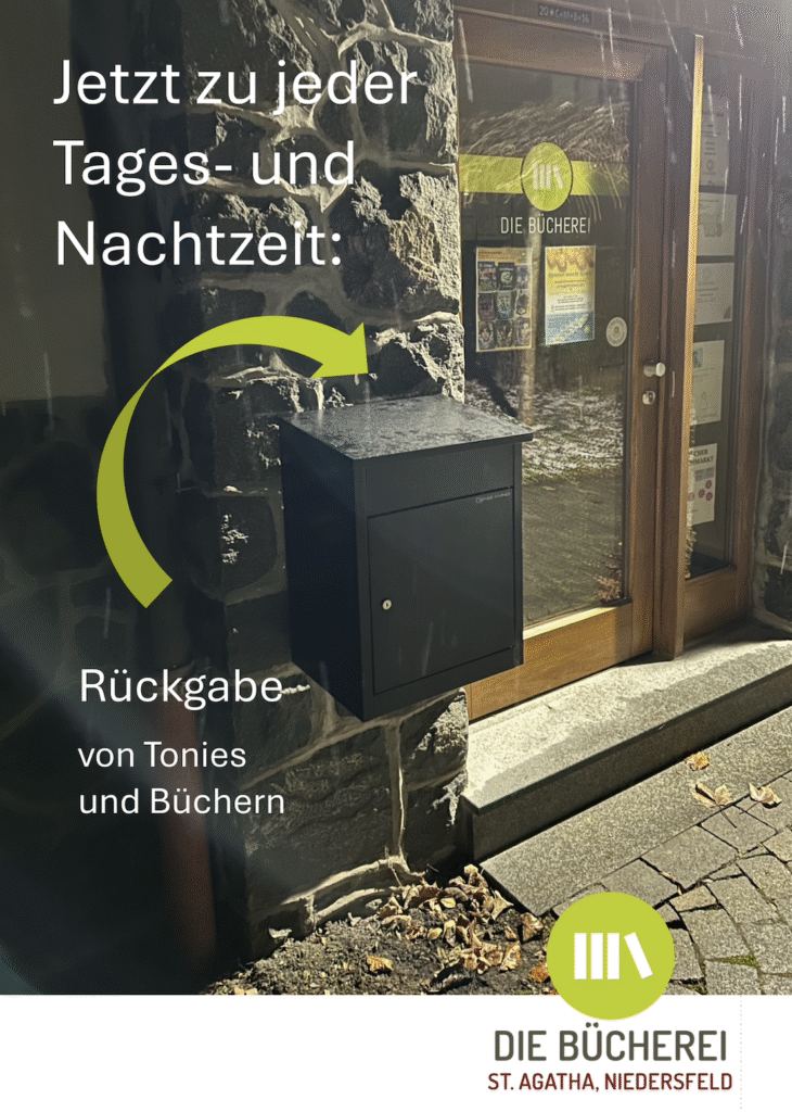 Die Bücherei im Josefshaus hat nun einen 24-Stunden-Service eingerichtet. Der Hausherr des Josefshauses, die Dorfgemeinschaft Niedersfeld e.V., hat einen großen Briefkasten beschafft und montiert. Die Kundinnen und Kunden der Bücherei können nun Bücher und Tonies jederzeit zurückgeben, auch wenn die Bücherei nicht geöffnet ist.