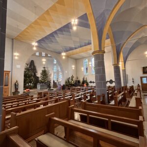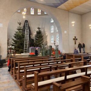 Alles ist für die Ankunft des Christuskindes vorbereitet. Auch die „Baummannschaft“ hat kräftig angepackt: der Altar wird von zwei großen Tannen geschmückt. So wurde kurz vor dem 4. Advent die Kirche weihnachtlich eingerichtet.