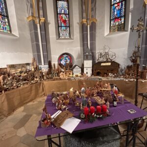 In der Kirche haben fleißige Helfer den Stall zu Bethlehem aufgebaut. Die Hirten sind unterwegs, die Schafe grasen und der Engel hat sich bereits positioniert. Auch die Dorfkrippe mit dem unverkennbaren Kirchturm und Giersen Scheune hat ihr Aussehen verändert.