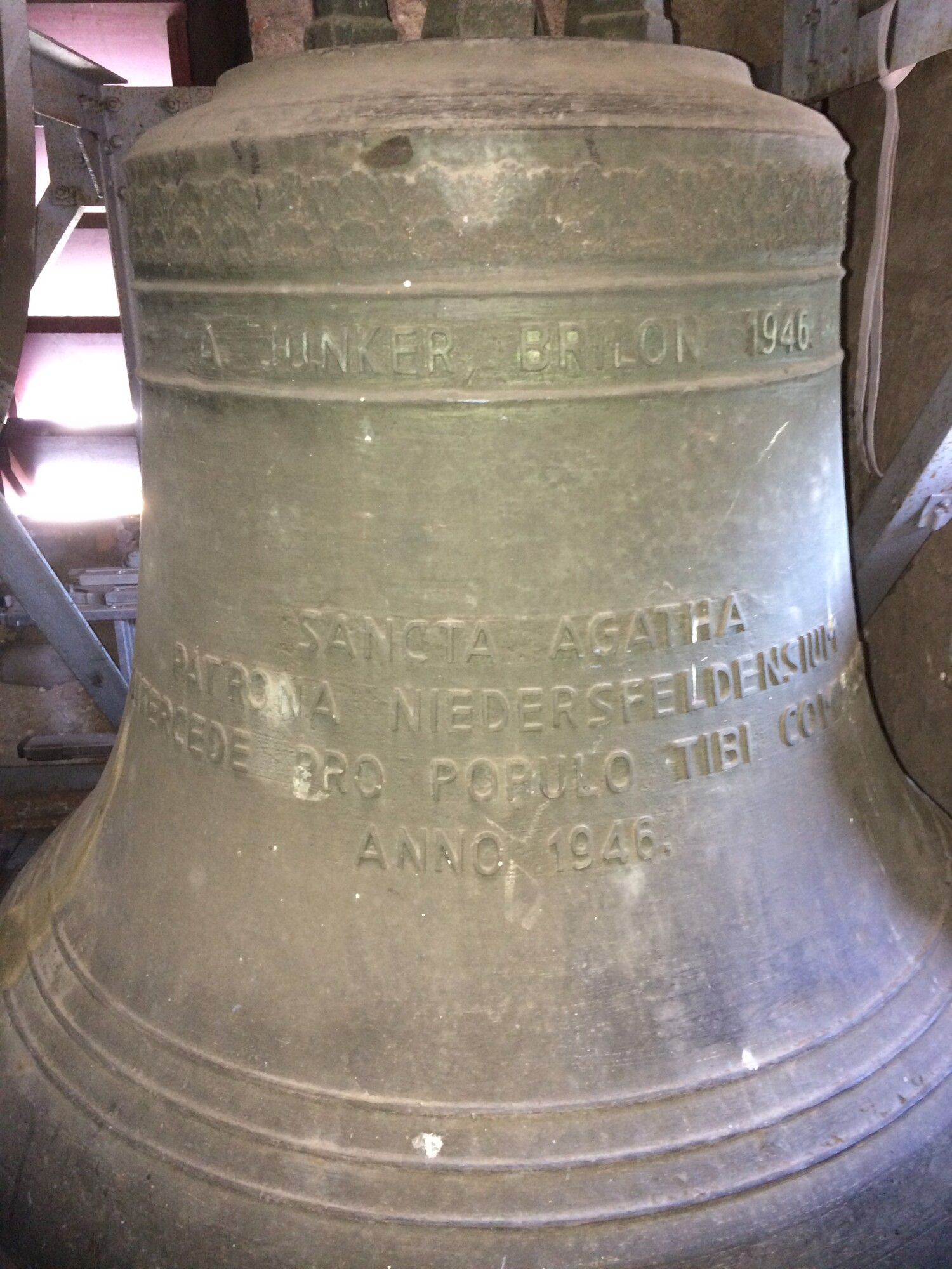 Inschrift (Höhe 3 cm): SANCTA AGATHA PATRONA NIEDERSFELDENSIUM INTERCEDE PRO POPULO TIBI COMMISSO. ANNO 1946.