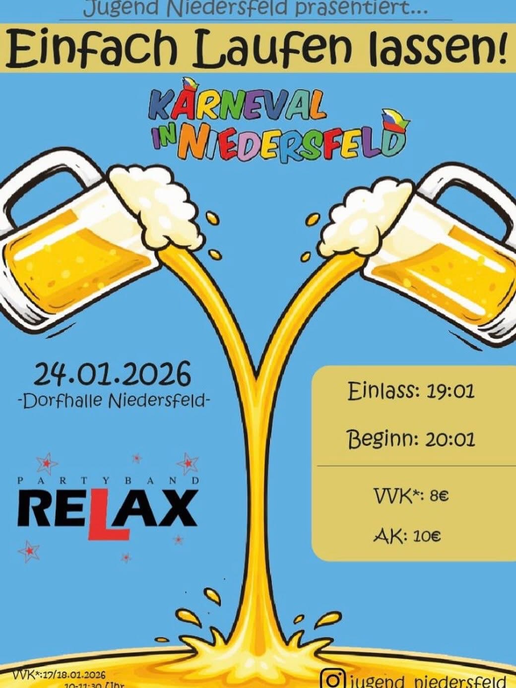 „Einfach Laufen lassen!“ So lautete das Motto des Abends beim großen Karneval in der Dorfhalle Niedersfeld. Das Programm war gespickt mit ordentlich gesalzenen Inhalten, spektakulären Einlagen und Dialogen, bei denen man die Ohren spitzte. Einige Programmpunkte drückten ordentlich auf die Tränendrüse und das bunt gemischte Publikum gab für das zweistündige Programm viel und berechtigten Applaus.