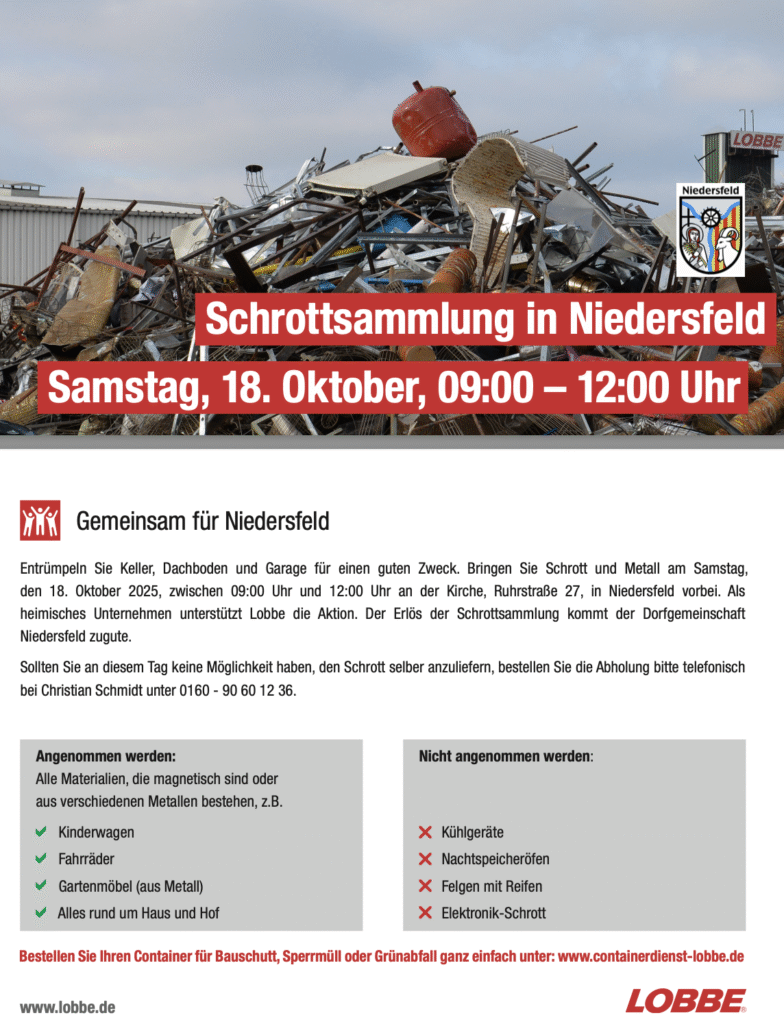 Die Dorfgemeinschaft Niedersfeld bietet am Samstag (18.10.) wieder die Möglichkeit, Metallwertstoffe kostenfrei und sinnstiftend abzugeben. Oftmals wird das als „Schrott“ benannte Material sorglos in den Mülltonnen entsorgt oder für teils dubiose Sammler an die Straße gestellt. Mit der organisierten Sammlung der Metallwertstoffe werden diese nicht nur ordnungsgemäß durch die Firma Lobbe weiterverwertet, obendrei ist der Erlös für Projekte des Dorfes bestimmt. Die Annahme ist am Samstag zwischen 9 und 12 Uhr auf dem Dorfplatz (HittenMitte) neben der Kirche.