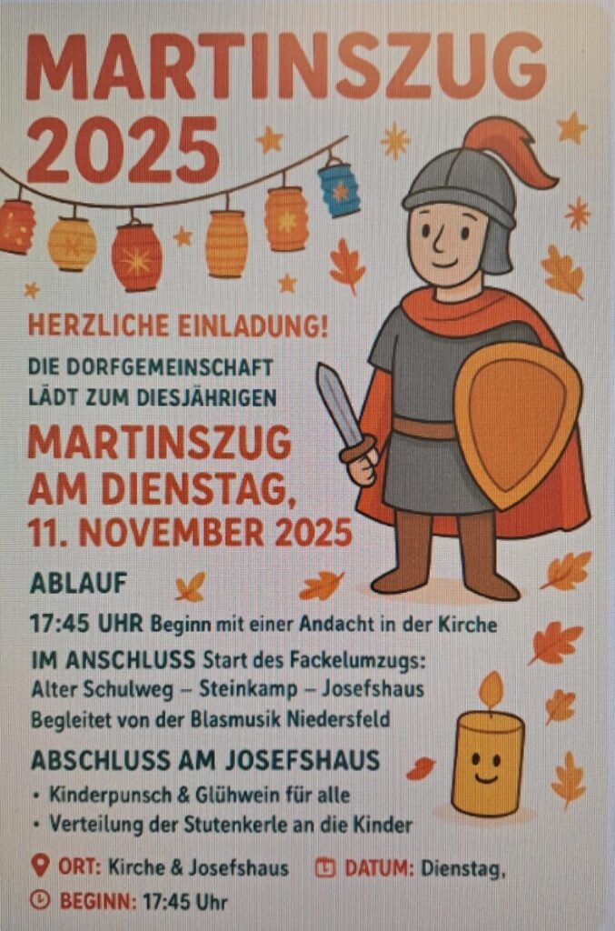 Am Dienstag, 11.11. feiern wir den Martins-Tag. Wir laden alle ein, um 17:45 Uhr in die Kirche zu kommen. Dort hören wir die Geschichte dieses Heiligen, der auch etwas mit Gänsen zu tun hat. Danach geht der Fackelzug unter musikalischer Begleitung der Blasmusik Niedersfeld und mit Unterstützung der Jugendfeuerwehr durch das Dorf. Ziel ist das Josefshaus, dort ist gemütliches Beisammensein und der Heilige Martin wird Stutenkerle verteilen.