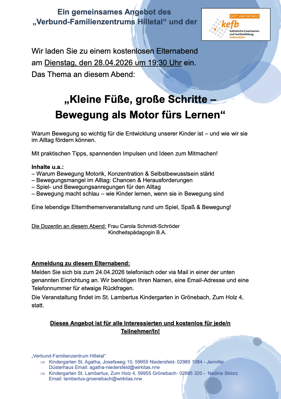 Wir laden Sie zu einem kostenlosen Elternabend am Dienstag, den 28.04.2026 um 19:30 Uhr ein.