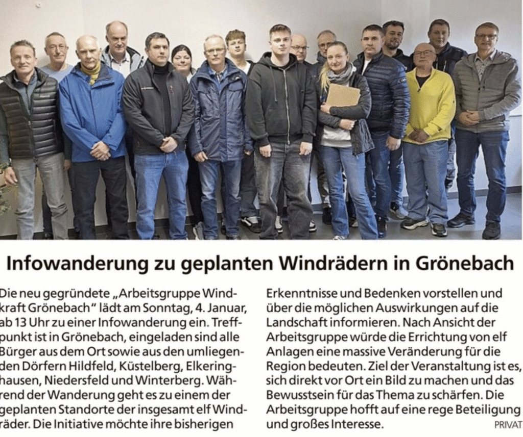 Die neu gegründete „Arbeitsgruppe Windkraft Grönebach“ lädt am Sonntag, 4. Januar, ab 13 Uhr zu einer Infowanderung ein. Treffpunkt ist in Grönebach, eingeladen sind alle Bürger aus dem Ort sowie aus den umliegenden Dörfern Hildfeld, Küstelberg, Elkeringhausen, Niedersfeld und Winterberg. Während der Wanderung geht es zu einem der geplanten Standorte der insgesamt elf Windräder. Die Initiative möchte ihre bisherigen Erkenntnisse und Bedenken vorstellen und über die möglichen Auswirkungen auf die Landschaft informieren. Nach Ansicht der Arbeitsgruppe würde die Errichtung von elf Anlagen eine massive Veränderung für die Region bedeuten. Ziel der Veranstaltung ist es, sich direkt vor Ort ein Bild zu machen und das Bewusstsein für das Thema zu schärfen. Die Arbeitsgruppe hofft auf eine rege Beteiligung und großes Interesse.