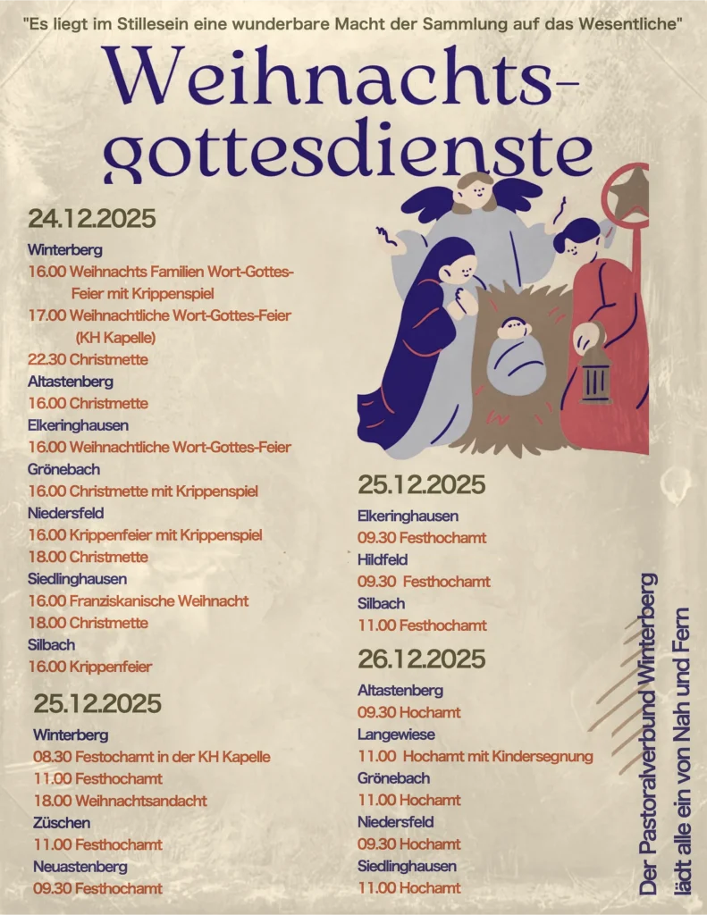 Im Pastoralverbund Winterberg gibt es an Heilig Abend, am 1. Weihnachtstag und am 2. Weihnachtstag unterschiedliche Gottesdienstangebote.