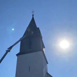 Reparatur der Kirchturmuhr. Sie befindet sich oberhalb des Glockenstuhls in der Spitze des Kirchturms.